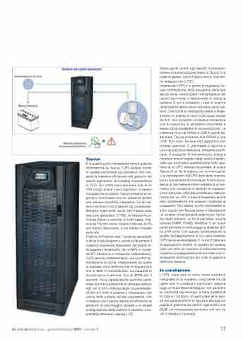 Innanzitutto l’UPS è in grado di segnalare l’er- rata connessione della sequenza delle fasi senza dover interrompere l’alimentazione dei carichi da inverter e mantenendo in carica le batterie. E poi è possibile il test di scarica delle batterie senza dover utilizzare carichi es- terni. Così come è interessante avere a dispo- sizione un display a colori LCD touch screen da 4,3” che consente un’intuitiva interazione con la macchina. E altrettanto importante è avere ottime possibilità di comunicazione. La presenza di porte RS232 e USB è quindi es- senziale. Taurus presenta due RS232 e una USB. Non solo, ha due slot aggiuntivi per schede opzionali. E una messa in servizio e una manutenzione semplice, efficiente ed effi- cace. A proposito di manutenzione, bisogna ricordare che un registro degli eventi è essen- ziale per procedere speditamente nella ges- tione di un UPS. Ablerex ha pensato di dotare Taurus di un file di registro con le informazioni e le impostazioni dell’UPS facilmente scarica- bili su una scheda SD rimovibile. Anche la pre- senza di vani batterie interni estraibili è un ele- mento che consente di rendere la manuten- zione semplice, efficiente ed efficace. Natural- mente per un UPS è bene immaginare anche altre caratteristiche che possono migliorare le prestazioni. Può essere quindi interessante (e sono opzioni per Taurus) avere a disposizione un sensore di temperatura esterno per l’arma- dio delle batterie, un kit di parallelo, alcune schede SNMP, RS485, ModBus. E un touch panel permette il monitoraggio a distanza di fi- no a 64 unità. Con queste caratteristiche la qualità dell’applicazione in cui viene installato l’UPS se ne avvantaggerà. E, in particolare per le applicazioni critiche, la qualità non guasta: tutto ciò offre un risultato di funzionamento migliore e conseguentemente permette una in- teressante diminuzione dei costi di gestione dell’intero sistema.