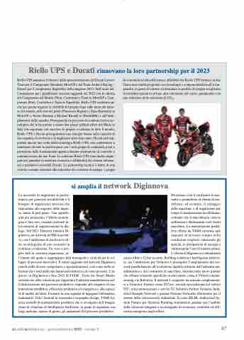 Riello UPS annuncia il rinnovo della sponsorizzazione del Ducati Lenovo Team per il Campionato Mondiale MotoGP e del Team Aruba.it Racing – Ducati per il campionato Superbike della stagione 2023. Sull’onda del- l’entusiasmo per i grandissimi successi raggiunti nel 2022 con la vittoria del Campionato del Mondo Piloti, Costruttori e Team in MotoGP e Cam- pionato Piloti, Costruttori e Team in Superbike, Riello UPS conferma an- che per questa stagione la visibilità del proprio logo sulle moto più famo- se del mondo, sulle tute dei piloti (Francesco Bagnaia e Enea Bastianini in MotoGP, e Alvaro Bautista e Michael Rinaldi in WorldSBK) e sull’abbi- gliamento delle squadre. Proseguendo un percorso di continua ricerca tec- nologica che le ha portate a essere due player globali alfieri del Made in Italy che esportano con successo le proprie eccellenze in tutto il mondo, Riello UPS e Ducati proseguiranno una sinergia basata sulla capacità di fare squadra, di evolversi e di migliorare anno dopo anno. Ducati sarà sup- portata ancora una volta dalla tecnologia Riello UPS, che contribuisce a mantenere elevate le performance con i suoi gruppi di continuità, posti a protezione delle fondamentali apparecchiature elettroniche di controllo e comunicazione dei due Team. Le soluzioni Riello UPS sono inoltre impie- gate per garantire la massima sicurezza e affidabilità dei sistemi informa- tici e produttivi aziendali Ducati. La partnership tecnica è frutto di una visione comune orientata alla riduzione dei consumi di energia: i gruppi