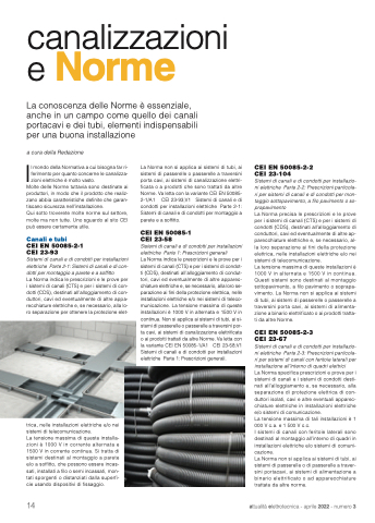 La Norma specifica prescrizioni e prove per i sistemi di canali e i sistemi di condotti desti- nati all’alloggiamento e, se necessario, alla separazione di protezione elettrica di con- duttori isolati, cavi e altre eventuali apparec- chiature elettriche in installazioni elettriche e/o sistemi di comunicazione.