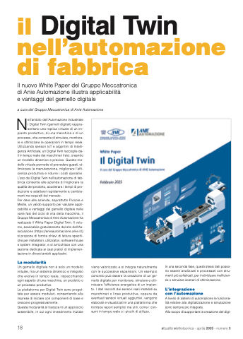 Per dare alle aziende, soprattutto Piccole e Medie, un valido supporto per valutare appli- cabilità e vantaggi del gemello digitale nelle varie fasi del ciclo di vita della macchina, il Gruppo Meccatronica di Anie Automazione ha realizzato il White Paper Digital Twin. Il volu- me, scaricabile gratuitamente dal sito dell’As- sociazione (https://anieautomazione.anie.it/) si propone di fornire chiavi di lettura specifi- che per installatori, utilizzatori, software house e system integrator, e si arricchisce con una sezione dedicata ai casi pratici di implemen- tazione in diversi ambiti applicativi.