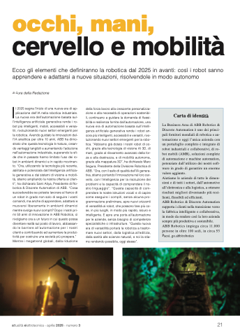 l’intelligenza artificiale generativa rende i ro- bot più intelligenti, mobili, accessibili e versa- tili, rivoluzionando nuovi settori emergenti per la robotica. Avendo guidato le innovazioni del- l’IA analitica per oltre 10 anni, ABB ha dimo- strato che questa tecnologia è matura, crean- do vantaggi tangibili e aumentando l’adozione nell’automazione industriale, superando le sfi- de che in passato hanno limitato l’uso dei ro- bot in ambienti dinamici e in rapido movimen- to. “Ora, utilizzando la tecnologia più recente, abilitata e potenziata dall’intelligenza artificia- le generativa e dai sistemi di visione e mobili- tà, stiamo ampliando la nostra offerta ai clien- ti”, ha dichiarato Sami Atiya, Presidente di Ro- botics & Discrete Automation di ABB. “Cosa succederebbe se poteste lavorare al fianco di un robot in grado non solo di seguire i vostri comandi, ma anche di apprendere, adattarsi e muoversi liberamente in ambienti dinamici mentre svolge nuovi compiti? Dopo i nostri pri- mi 50 anni di innovazione in ABB Robotics, ci rivolgiamo ora a un futuro in cui questo possa diventare realtà sul posto di lavoro, abbassan- do le barriere all’automazione per i nostri clienti e contribuendo ad aumentare la produt- tività per costruire una società più prospera.” Mentre i megatrend globali, dalla riduzione