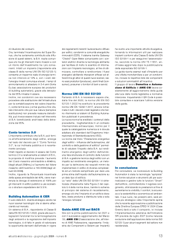 Per concludere, va riconosciuto la Building Automation è stata la tecnologia “apripista” nel fornire soluzioni e strumenti utili per auto- matizzare e gestire tutte le funzioni “Smart” dell’edificio, controllandone il regolare svol- gimento, ottimizzando le prestazioni al fine di aumentarne la vivibilità, il comfort, la sicurez- za e la sostenibilità e economica ed ambien- tale. Il suo ruolo, nei prossimi anni, sarà an- cora più strategico vista l’importante spinta che la recente approvazione e pubblicazione della Direttiva Europea EPBD IV 2024 (Case Green) darà a tutto il comparto, ivi inclusa l’implementazione estensiva dell’indicatore SRI prevista da luglio 2027 (come naturale evoluzione dell’applicazione della norma ISO 52120-1) per alcuni segmenti del settore non residenziale.