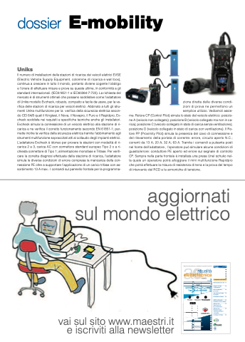 Il numero di installazioni delle stazioni di ricarica dei veicoli elettrici EVSE (Electric Vehicle Supply Equipment, colonnine di ricarica e wall box), continua a crescere in tutto il mondo, pertanto diviene cogente l’obbligo e l’onere di effettuare misure e prove su queste ultime, in conformità a gli standard internazionali. (IEC61851-1 e IEC60364-7-722). La richiesta del mercato è di strumenti ottimali che possano soddisfare come l’adattatore di Uniks modello Evcheck, robusto, compatto e facile da usare, per la ve- rifica delle stazioni di ricarica per veicoli elettrici. Abbinato a tutti gli stru- menti Uniks multifunzione per la verifica della sicurezza elettrica secon- do CEI 64/8 quali il Kingtest, il Nova, il Novapro, il Puro e il Rapidpro, Ev- check soddisfa nei requisiti e specifiche tecniche anche gli installatori. Evcheck simula la connessione di un veicolo elettrico alla stazione di ri- carica e ne verifica il corretto funzionamento secondo EN 61851-1; per- mette inoltre la verifica della sicurezza elettrica tramite l’abbinamento agli strumenti multifunzione sopraccitati atti al collaudo degli impianti elettrici. L’adattatore Evcheck è idoneo per provare le stazioni con modalità di ri- carica 2 e 3, carica AC con connettore standard europeo Tipo 2 o a ri- chiesta connettore di Tipo 1; alimentazione monofase e Trifase. Per verifi- care la corretta diagnosi effettuata dalla stazione di ricarica, l’adattatore simula le diverse condizioni di errore compresa la mancanza della con- nessione PE oltre a supportare l’applicazione di un carico trifase con as- sorbimento 13 A max.. I comandi sul pannello frontale per la programma-