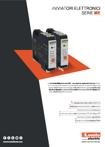 Gli avviatori elettronici serie ME... sono ideali per applicazioni che necessitano di un numero molto elevato di avviamenti e risparmio di spazio all’interno del quadro. Sono realizzati con tecnologia ibrida, che combina il vantaggio della lunga vita di un dispositivo a semiconduttore esente da usura, all’elevata robustezza e