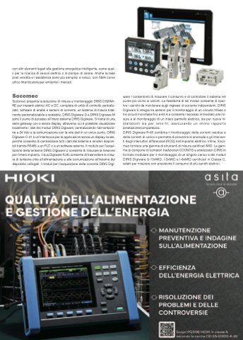 DIRIS Digiware R-60 combina il monitoraggio delle correnti residue e delle correnti di carico e permette di prevenire le anomalie e gli interven- ti degli interruttori differenziali (RCD) nell’impianto elettrico. Infine, Soco- mec fornisce una gamma di strumenti di misura certificati MID. La gam- ma si compone di contatori tradizionali COUNTIS e analizzatori DIRIS in formato modulare per il monitoraggio di un singolo carico e dei moduli DIRIS Digiware S-13xMID, I-3xMID e I-6xMID certificati in Classe C, adatti per misurare con precisione il consumo di più carichi elettrici.