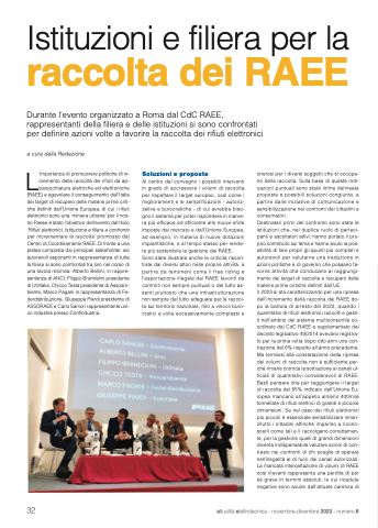 (RAEE) e agevolare il conseguimento dell’Italia dei target di recupero delle materie prime criti- che definiti dall’Unione Europea, di cui i rifiuti elettronici sono una ‘miniera urbana’ per il nos- tro Paese è stato l’obiettivo dell’evento dal titolo ‘Rifiuti elettronici. Istituzione e filiera a confronto per incrementare la raccolta’ promosso dal Centro di Coordinamento RAEE. Di fronte a una platea composta dai principali stakeholder, sei autorevoli esponenti in rappresentanza di tutta la filiera si sono confrontati tra loro nel corso di una tavola rotonda: Alberto Bellini, in rappre- sentanza di ANCI, Filippo Brandolini presidente di Utilitalia, Chicco Testa presidente di Assoam- biente, Marco Pagani in rappresentanza di Fe- derdistribuzione, Giuseppe Piardi presidente di ASSORAEE e Carlo Samori rappresentante uni- co industria presso Confindustria.