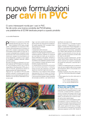 Nel testo che segue le indicazioni sui nuovi studi realizzati da PVC4Cables che dimostra- no che è possibile produrre cavi in PVC di classe B2ca s1 d0 a3 secondo il CPR e che, in caso di incendio, garantiscono almeno la stessa sicurezza dei materiali alternativi. Dagli anni ‘50, i cavi elettrici in PVC sono stati prodotti e utilizzati in un’ampia gamma di ap- plicazioni con ha requisiti specifici peculiari in relazione a ciò che devono trasmettere e a do- ve sono usati.