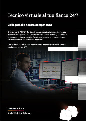 Grazie a VertivTM LIFETM Services, il nostro servizio di diagnostica remota e monitoraggio preventivo, i tuoi dispositivi critici si mantengono sempre in contatto con i nostri Service Center, con la certezza di massimizzare sia la disponibilità che l’efficienza operativa.