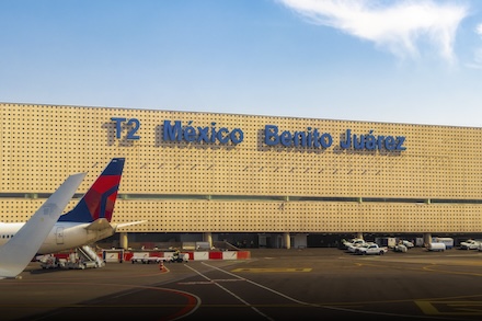 Penon de los Banos Venustiano Carranza Mexico City Mexico 06. February 2021 Aircraft at the airport Building and runway Aeropuerto Internacional Benito Juarez in Mexico City Mexico.